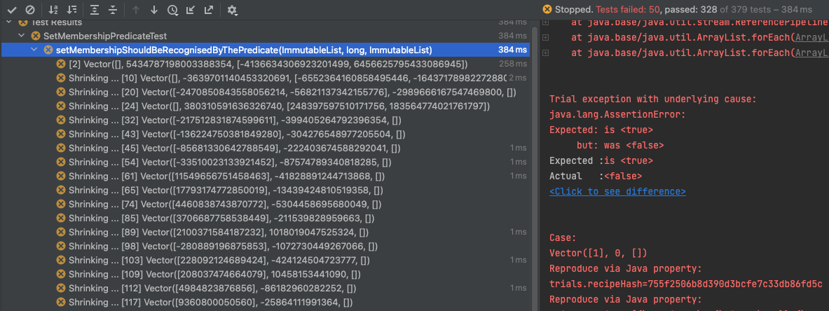 Americium’s JUnit5 integration gives you the best of both worlds: property-based testing with shrinkage, plus IDE integration that shows individual trial runs, shrinkage attempts, and lets you replay specific cases.